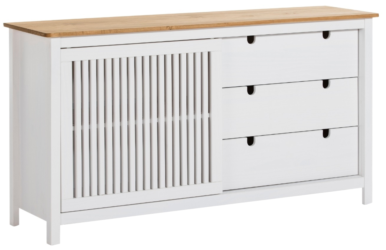 Bílá komoda Bruna od značky Marckeric ze stejnojmenné řady nábytku nabízí praktický úložný prostor v podobě 3 zásuvek a uzavřených polic s posuvnými dvířky. Komoda Bruna si najde své místo nejen v obývacím pokoji, ložnici, ale i v pracovnách. Obdélníkový matně lakovaný korpus z masivního borovicového dřeva je kontrastně doplněn horní deskou, která je zanechaná v přírodním borovicovém odstínu. Zkombinujte tento kousek také s ostatními produkty řady Bruna, získejte díky tomu dokonalou souhru nábytku ve vašem interiéru.